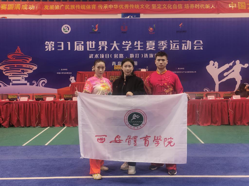 本网讯    4月1日至5日,第31届世界大学生夏季运动会武术项目选拔赛在山东青岛城阳体育馆落下帷幕。我校武术套路代表队学生唐潘、武卓文在教师罗雪琳的带领下与全国各省市的37所大学、130余名运动员同场竞技、激烈角逐,最终唐潘获得女子自选长拳项目和女子自选剑术项目两枚金牌。