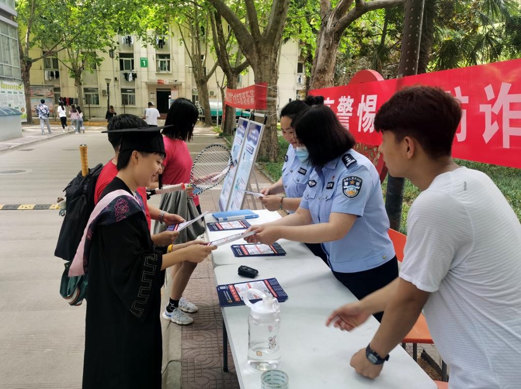 本网讯 为进一步提高我校师生员工安全防范意识,预防和减少各类电信诈骗案件的发生,维护师生的切实利益,5月17日,我校联合红缨路派出所开展反电信网络诈骗宣传活动。红缨路派出所魏娜警官,我校保卫处副处长王刚、治安科科长祝博文等参加了活动。
